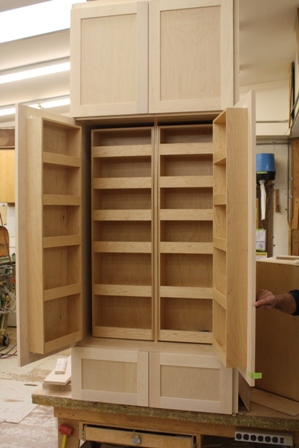 For open cabinets and cabinets with glass doors, we build the boxes using 3/4” plywood in the species that matches the front.