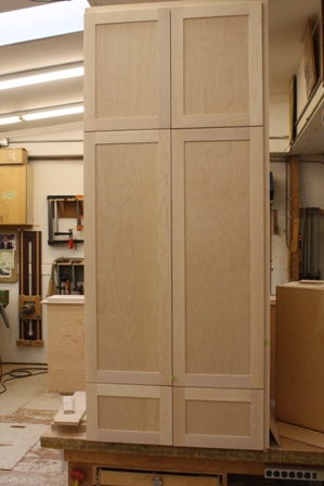 The drawers are made from 1/2” prefinished maple with a 1/4" bottom on small drawers or a 1/2" bottom on larger or heavy duty drawers that also get heavy duty hardware. These boxes are assembled using biscuits.