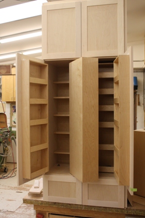 For open cabinets and cabinets with glass doors, we build the boxes using 3/4” plywood in the species that matches the front.